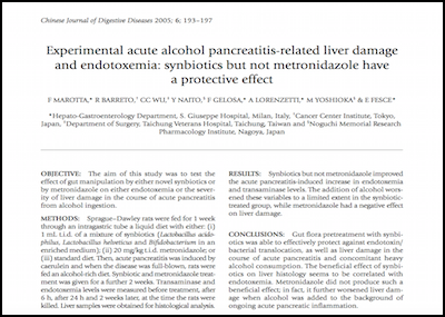 The aim of this study was to test theeffect of gut manipulation by either novel synbiotics orbymetronidazole on either endotoxemia or the sever-ity of liver damage in the course of acute pancreatitisfrom alcohol ingestion.